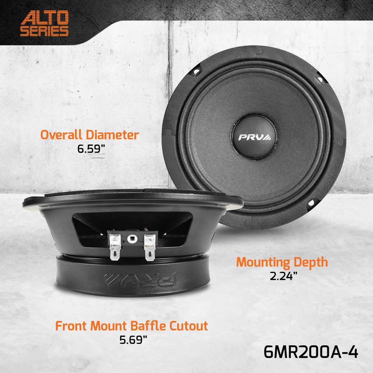 PRV Audio’s ALTO Series were carefully crafted and voiced to reproduce a natural, smooth sound while remaining dynamic. To get the superior fidelity, a special composite cone is used to smooth frequency response and to keep the moving mass low, increasing the efficiency. The 6MR200A-4 midrange speaker is our solution for PROAudioOnWheels® for Car audio systems.