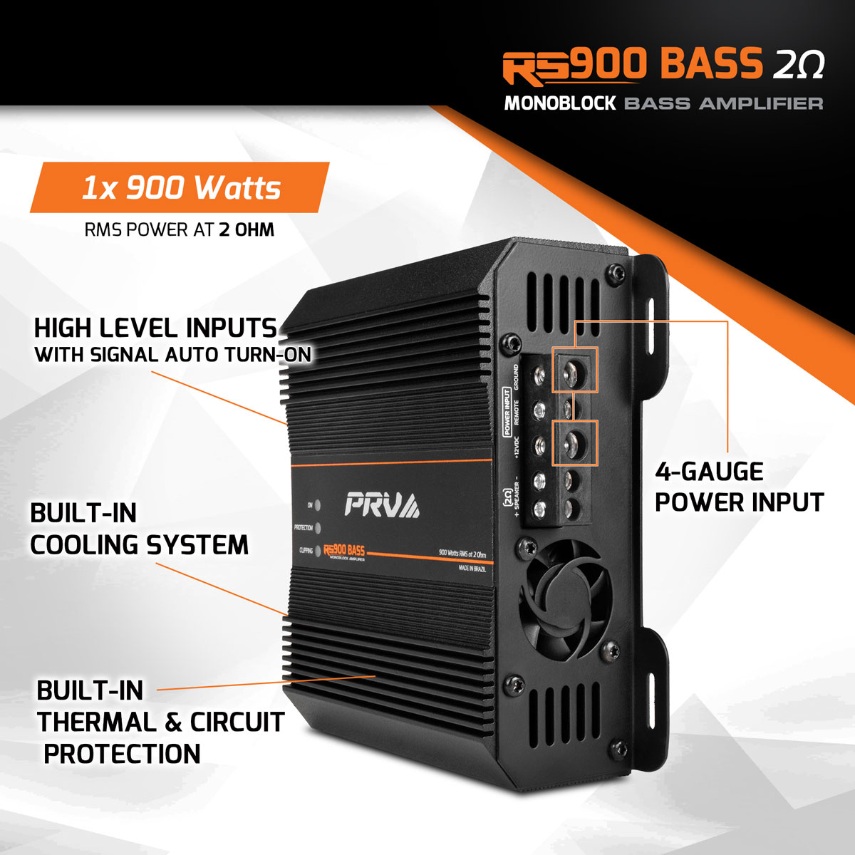- Smart Bass Amplifier – Monoblock 1 Channel 900 watts at 2 Ohm TRUE RMS certified. Intelligent 4-way protection circuitry features high voltage, low voltage, shortage, and current protection. Built-in Clip LED indicators on the top panel.