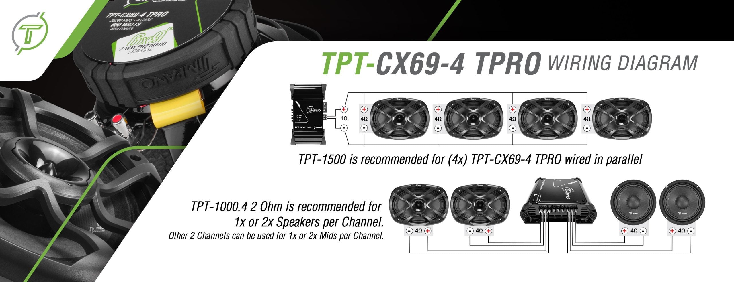 Install multiple speakers on a single system amplifier, you can easily wire 4x speakers in parallel to a TPT-1500 at 1 Ohm. Taking your custom system to the maximum output level, where you can drive with the windows down and still have your music heard over down on the block.